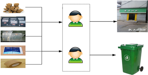 基于智能快递柜的快递包装盒回收运营模式,打破了快递包装盒传统的回收模式。传统的校园快递包装盒回收模式是快递公司将瓦楞纸箱、快递胶带、快递气泡袋、快递文件等包装物封装物品后配送给客户,最后只有极少量的快递包装将会被废品回收站或者校园快递中心回收利用,其余大多则直接被丢弃浪费。快递包装直接被丢弃的很大原因是校园内没有统一的废品回收站点。本研究则从高校着手,结合货车返程空驶现象,设计出一款校园APP,在智能快递柜处设置统一的废品回收站点。学生可选择在取完快递后将待回收的快递包装放置在刚取完快递的智能快递柜内;或者储存一定量可回收快递包装后,在APP中查询是否有空置智能快递柜,再将待回收的快递包装放置在空置智能快递柜中;快递员在投放新快递的时候用APP记录智能快递柜中是否有快递包装盒,再取出智能快递柜中的快递包装盒,返程时将所有的快递包装装入货车并运往废品回收站或加工厂重塑后运往快递公司。APP的使用,结合了绿色物流与逆向回收物流的优势,不仅回收了废弃的快递包装,并且解决了货车返程空驶的浪费现象,符合响应了国家倡导的绿色物流发展理念。传统校园快递包装回收模式如图2,APP改进的智能快递柜的快递包装盒回收模式如图3。
