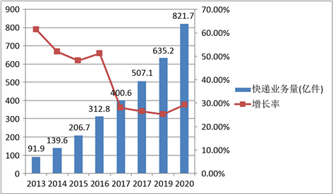 此研究从高校出发不仅可以节约资源保护校园环境,而且成吨的快递包装回收再利用也可以为企业带来一定的利润,实现降本增效。2013~2020年快递业务量如图1。
