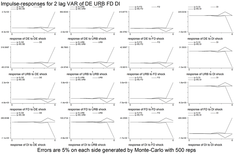 其中: ytyt是由DE、FD、URB、DI构成的四维内生变量向量,即 yt=(DEt,URBt,FDt,DIt)′yt=(DEt,URBt,FDt,DIt)′,p为滞后阶数, β0,β1,⋯,βpβ0,β1,⋯,βp为系数向量矩阵, εtεt为4维随即扰动向量,且 εtεt满足 cov(εt−i,εt−j)=0,i≠j,cov(εt−i,yt−k),cov(εt−i,εt−j)=0,i≠j,cov(εt−i,yt−k),i,j,k=1,2,⋯,pi,j,k=1,2,⋯,p即当期和滞后期之间不相关,且扰动项和等式方程中的其他变量不相关。