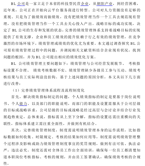本论文根据 BL 公司的员工绩效满意度调查的结果,运用理论与实践相结合的方法,分析了 BL 公司绩效管理与公司经营发展脱节、考核指标设置不合理、绩效考核数据不实、绩效管理缺少各级员工参与互动、绩效考核结果与员工实际利益没挂钩等绩效存在的问题。并就问题提出了改善绩效考核体系优化方案,包括公司层级、部门层级与岗位人员绩效考核指标体系优化方案;其次,提出了在绩效考核结果应用优化方案,优化范围涵盖薪酬及奖金的分配、岗位异动以及职业生涯发展等。为确保方案的顺利实施,制定了制度与组织保障措施、资金保障以及过程监控保障措施。